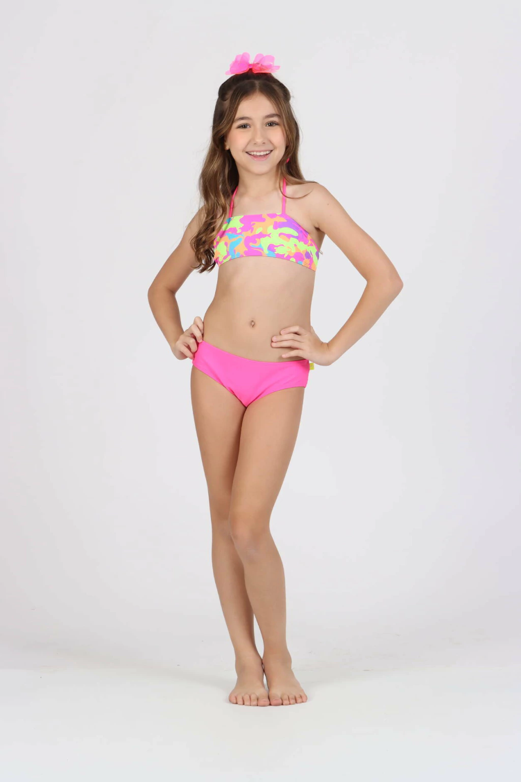 O Biquíni Faixinha Kids Rafa Estampa Oceano Camuflado da Siri é ideal para meninas que amam brincar, nadar e se divertir com conforto e atitude. Com top estilo faixinha e calcinha com laterais largas, ele traz uma estampa moderna que mistura tons do mar em um visual camuflado cheio de personalidade.