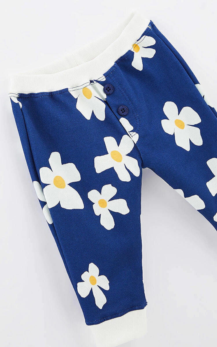 A blusa de moletom apresenta um design charmoso, com uma estampa de flores delicadas em tons de azul, que adicionam um toque de doçura ao visual. O capuz acrescenta um elemento de estilo e praticidade, mantendo o bebê protegido e confortável.