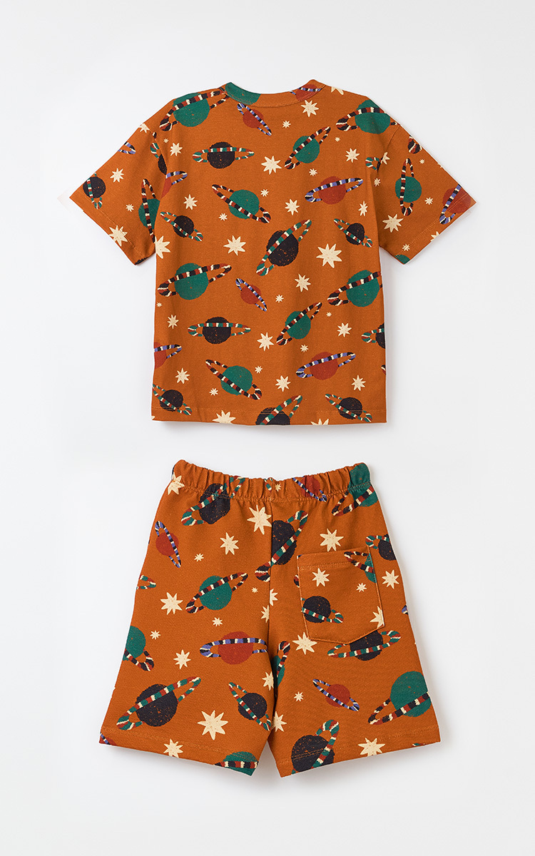 A estampa Planetônico traz um visual cósmico com cores contrastantes sobre o fundo marrom, criando uma atmosfera de aventura intergaláctica. Elementos gráficos como planetas, satélites e formas orbitais despertam a imaginação e transformam o vestir em brincadeira.