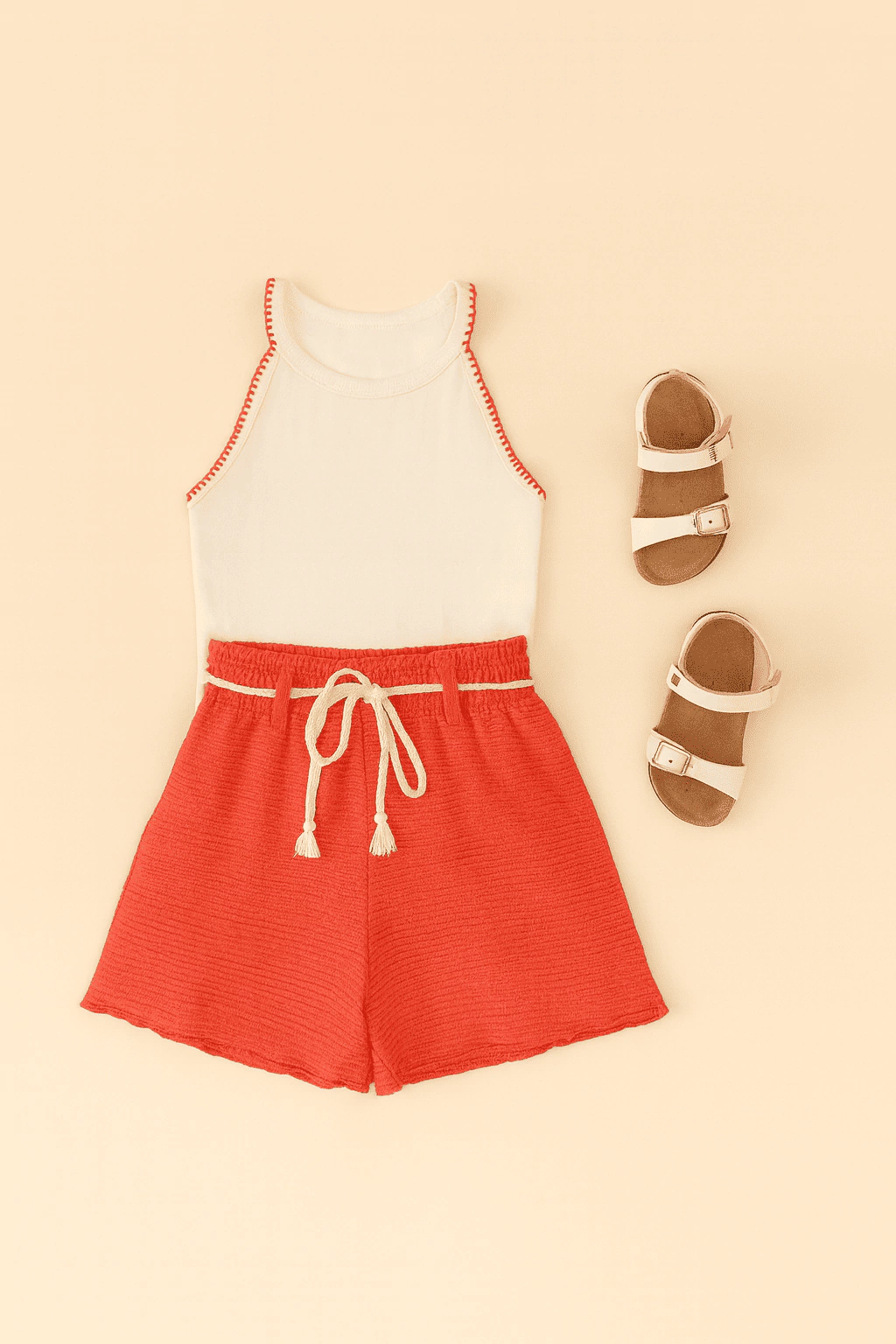 Com blusa e shorts combinando, o conjunto facilita a escolha do look e ainda garante múltiplas combinações. É ideal para dias quentes, proporcionando frescor e bem-estar.