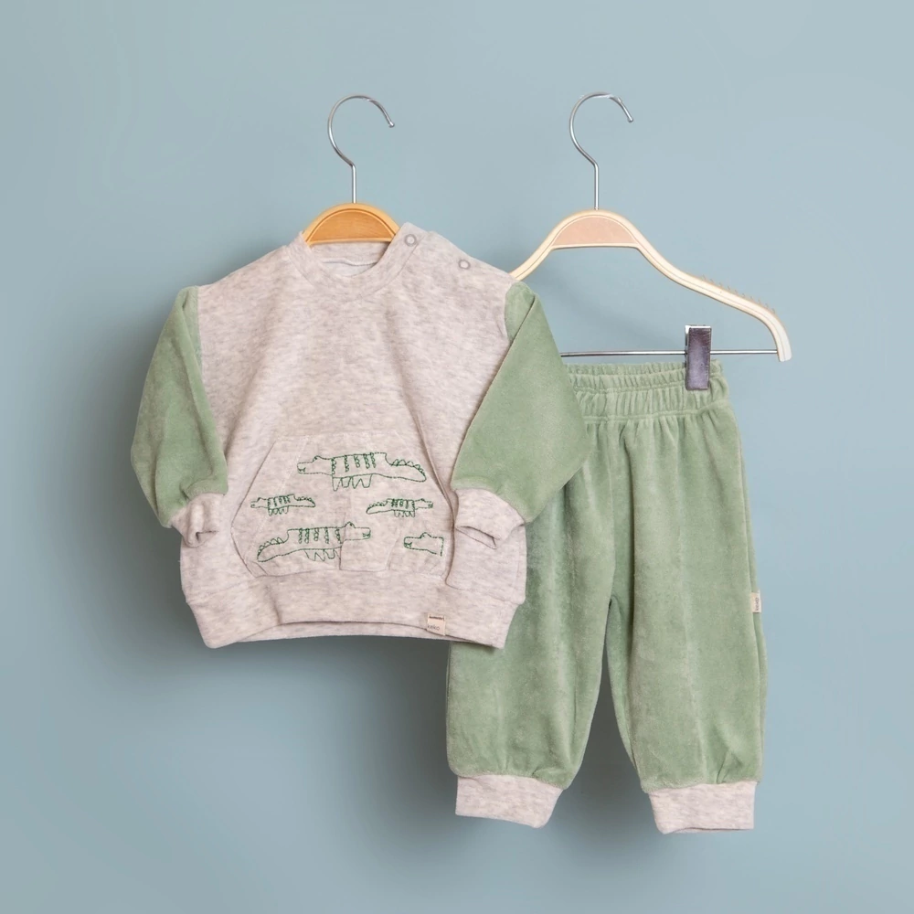 O Conjunto Bolso Crocodilos Kids da marca Keko apresenta uma combinação charmosa de cinza e verde, composto por uma calça e um moletom. Ambas as peças possuem bolsinhos frontais com detalhes bordados de crocodilos, adicionando um toque especial ao conjunto. Ideal para diversas ocasiões, este conjunto é lúdico, confortável e quentinho, garantindo que a criança fique estilosa e aconchegante em todas as atividades.