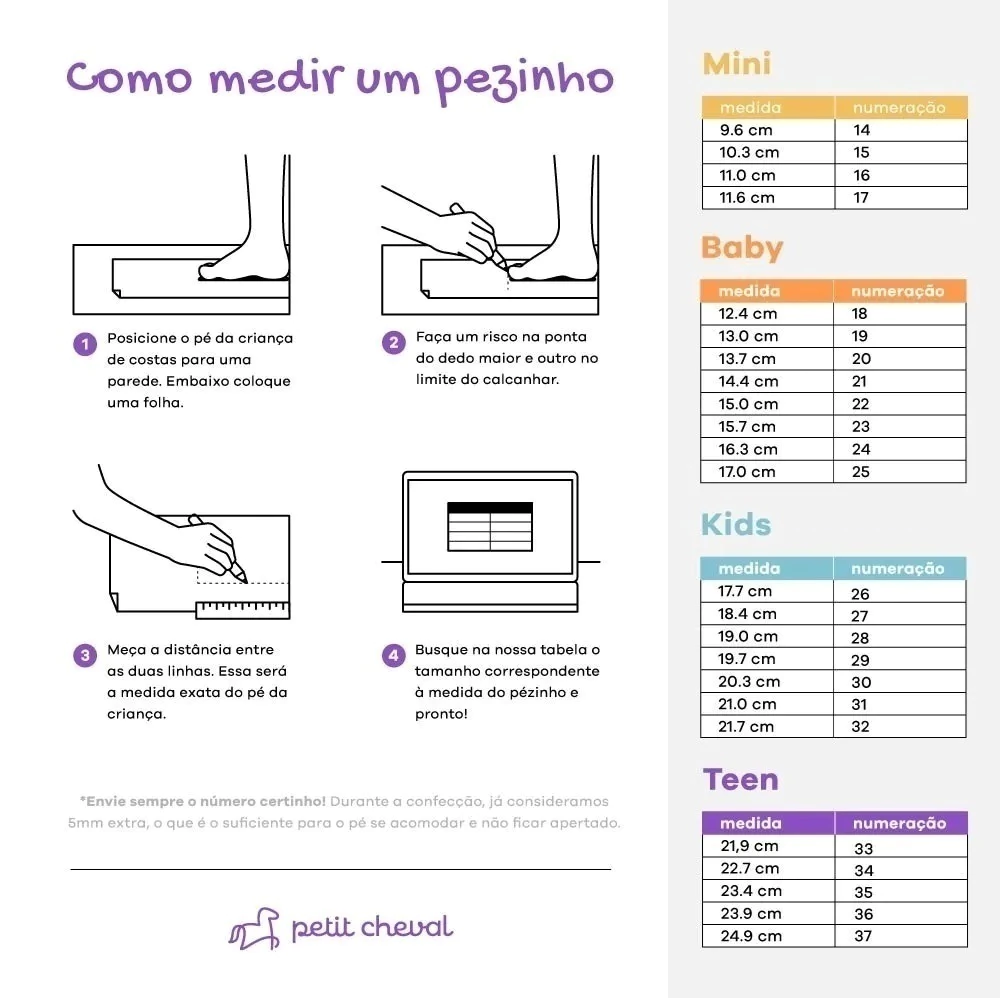 Tem a marca registrada da Petit Cheval: muito fácil de tirar e colocar, o fechamento em velcro facilita o dia a dia da mãe e promove a autonomia da criança. Ajustável no tornozelo, é aliada nos dias mais quentes — que o pezinho e tornozelo incham — e é possível aumentar ou diminuir a tira em velcro.