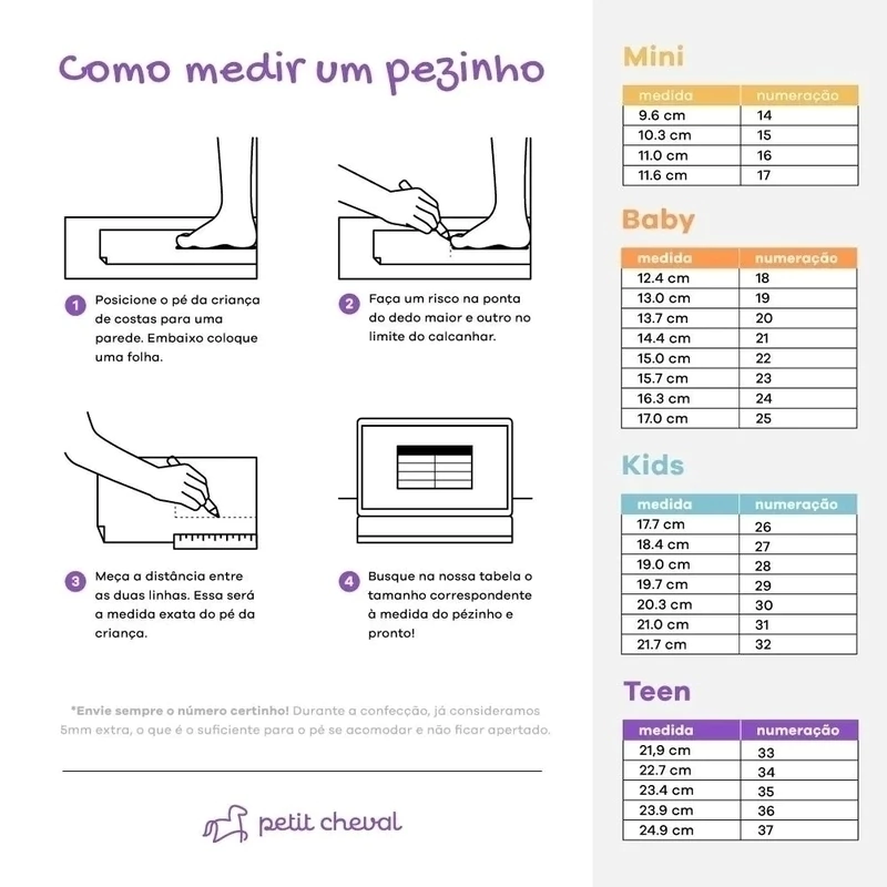 A vida de mãe acaba sendo um pouco corrida, não é? Se você é do time da praticidade, saiba que estamos contigo nessa! O Sapato Infantil Balanço é todo feito em couro, que é mais fácil de ser mantido limpo e tem alta durabilidade. Siga as instruções de limpeza e armazenamento e mantenha seu Petit Cheval por gerações: