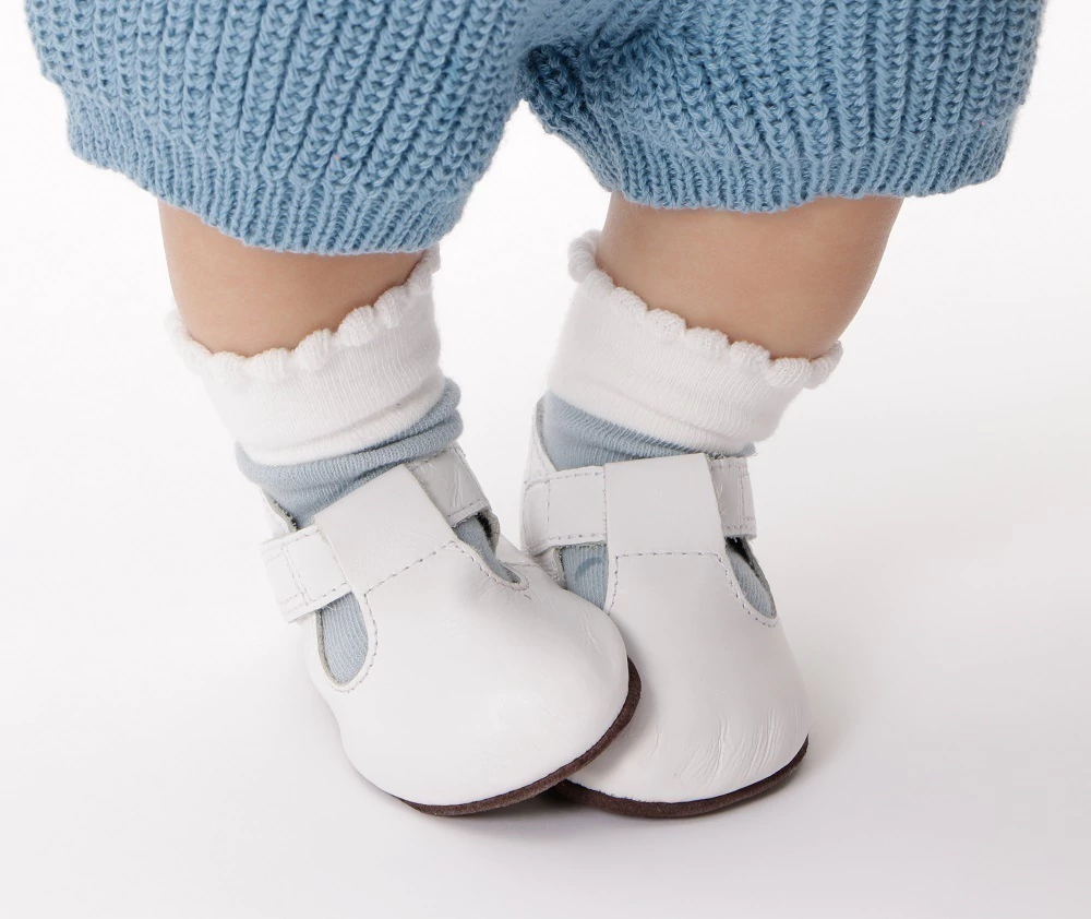 A sola é feita de um couro um pouquinho mais áspero, o que torna o sapatinho antiderrapante para o bebê