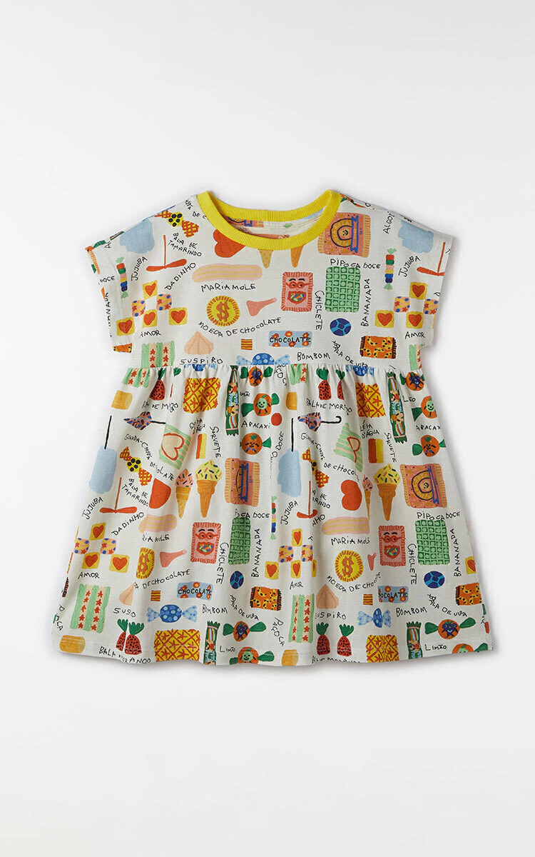 • Estampa exclusiva “Guloseima”, vibrante e divertida