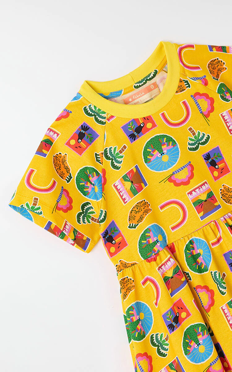 O Vestido Malha Postales da Fábula é uma viagem visual pelas paisagens mais lindas da infância. Com estampa inspirada em cartões-postais tropicais, ele combina leveza, liberdade e uma explosão de cores que traduz o espírito alegre e criativo da marca. Feito em malha macia e com modelagem soltinha, é ideal para brincar, passear e celebrar cada momento com estilo e conforto.