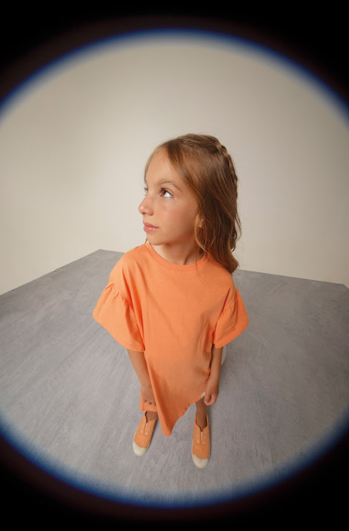 Vestido infantil feminino em meia malha, com detalhe em recortes centrais frente e costa pespontados e etiqueta sarjada, presa acima da barra. Decote com acabamento em ribana. Manga ampla dupla com efeito amplo. Barra bainha padrão.