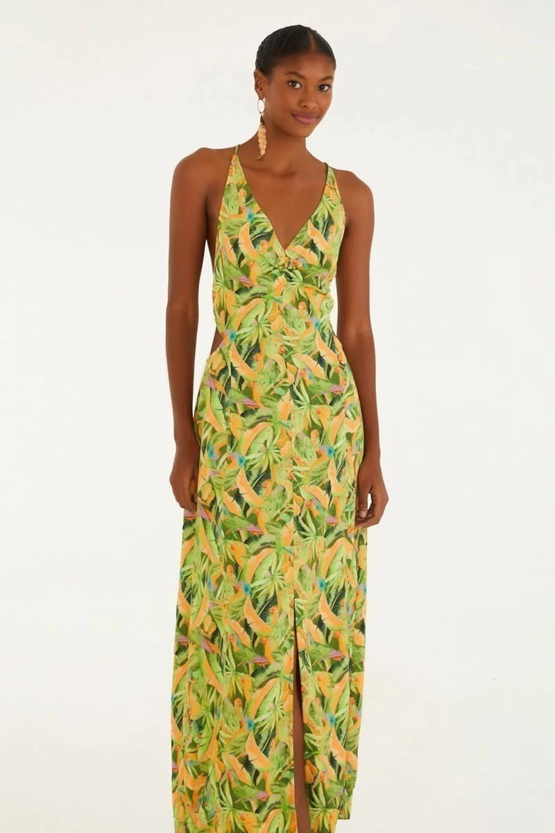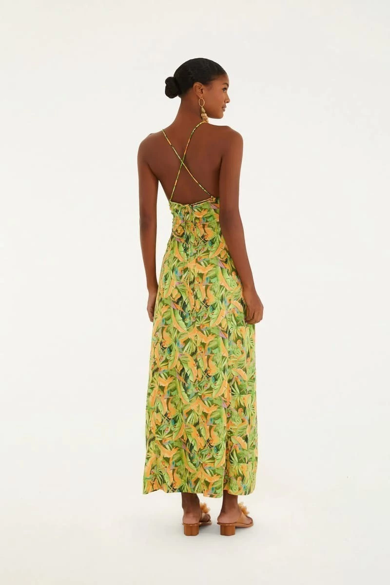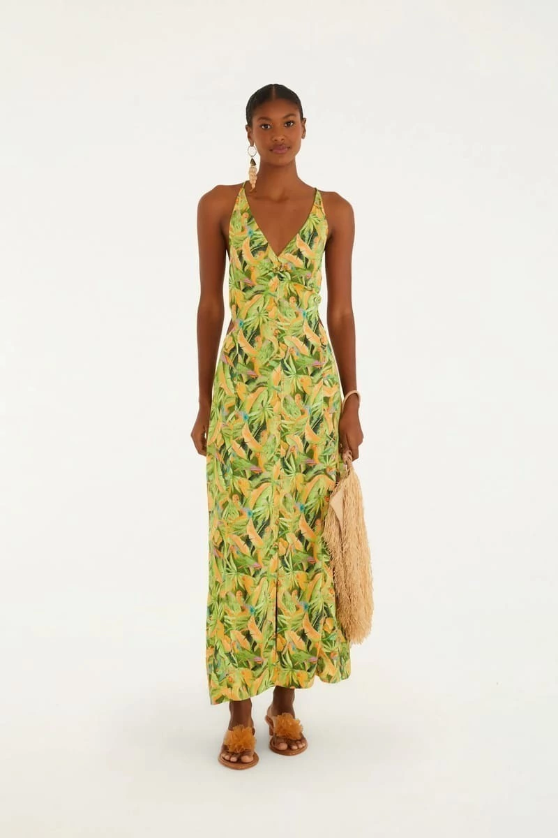 O vestido combina elementos da natureza com um corte moderno e feminino, resultando em uma peça versátil e marcante. Perfeito para quem ama vestir arte e quer celebrar o Brasil com cores, formas e poesia no dia a dia.