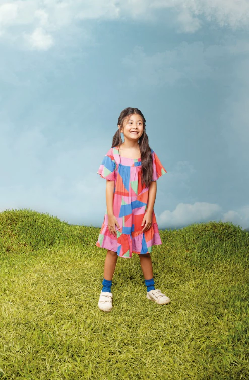 Vestido infantil feminino em viscose plana estampada, com detalhe em recorte horizontal sobre o peito, com detalhe em plaquinha New Bugbee vazado, preso sobre o mesmo e recorte franzido próximo a barra. Decote com acabamento em debrum, com abertura em gota na costa, com botão abaulado. Manga com efeito godê e barra bainha estreita.